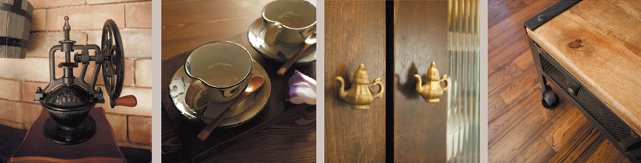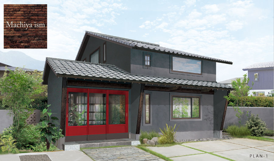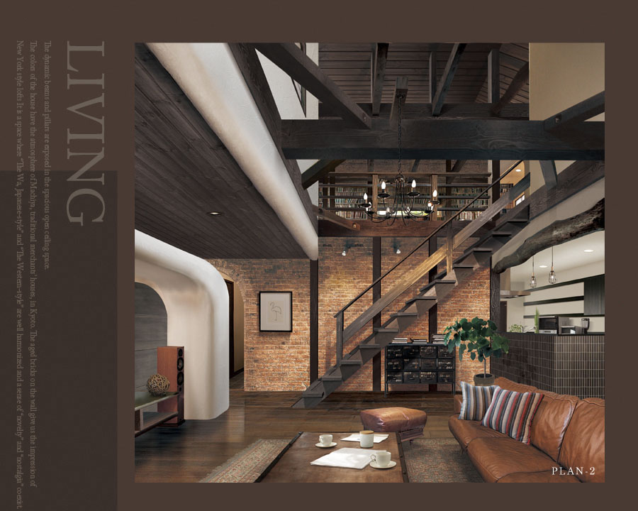 開放感のある吹抜け天井に、力強い梁や柱があらわれ、色づかいに町家の雰囲気を感じる。 壁にはNYロフトを思わせるブリックタイルのエイジング感。 『和』と『洋』がコラボする[ 新しさ ] × [ 懐かしさ ] の宿るスペース。