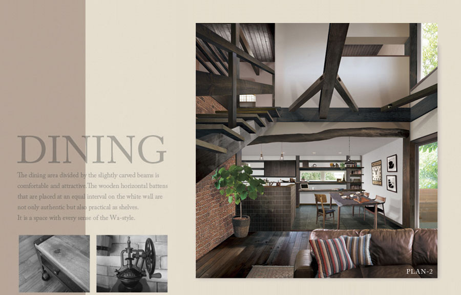 ゆるい曲り梁で区切られたダイニングスペースは、落ち着き感が魅力。 白い壁に均等な横ラインの桟木が走ったしつらえは、棚を兼用した機能美を合わせ持つ、 和のディティールが息づく空間。